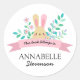 Adorável adesivo de livro com um coelho amarelo sentado entre flores.