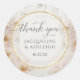 "Floral Modern Geométrico Dourado Glitter Obrigado Clássico Do Adesivo Redondo." Caligrafia elegante, mensagem de "obrigado você" para autocolantes e selas para casamento ou chá de panela, tipografia de script junto com os nomes dos casais e data de casamento sobre um moderno e simples esboço dourado, círculo geométrico estilo velum circular ao estilo velum sobre um fundo romântico mal cor-de-rosa orquídeo. Concebido por artista e designer com licença internacional, Audrey Jeanne Roberts, copyright.