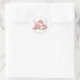 A sweet round sticker for a bridal shower themed around “Love Is In Bloom.” The design features a simple serif font placed around the edge for a clean, timeless look. In the center, a watercolor blush pink teapot with a matching teacup is surrounded by delicate pink flowers for a soft, charming feel.