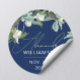 Este elegante adesivo redondo tem uma design na moda feminina com flores brancas com folhas verdes contra um fundo azul na moda e um nome personalizável manuscrito moderno e alguma data personalizável. Mude os textos e faça seus próprios adesivos! Você pode encontrar produtos correspondentes na nossa coleção de ANIVERSÁRIO NA MODA.