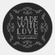 Adesivo elegante com as palavras "Feito com Amor" entre floreios, tudo em branco, contra uma cor de fundo editável (clique em personalizar para alterar). Este adesivo é ótimo para artesãos e criadores de produtos artesanais, como artistas, tricoteiros e costureiras. Pode ser usado ao presentear seus produtos artesanais ou como etiquetas de produtos.