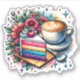 Um bonito bolo de aniversário em forma de aquarela, com flores e cereja ao lado de uma xícara de café.