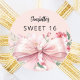 Um fundo cor-de-rosa pincelado. Decorado com um grande arco e flores cor-de-rosa, rosas. Personalize e adicione um nome. Script de estilo manuscrito preto.