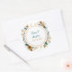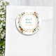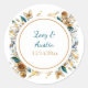 Adesivos de casamento personalizados com efeito 3D de flores e borboleta em quilling de papel. As cores são principalmente branco e dourado com um toque de azul pálido. Adicione o nome do noivo e da noiva e a data do casamento na área personalizada.