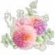 As Flores de Dahlia Rosa têm duas lindas flores rosa e roxo pintadas de Dahlia e um pequeno e bonito bud. Folhas verdes e caules de flores brancas pequenas atuam como sotaque na imagem padronizada. O conjunto solteiro de flores é grande e se estende além das bordas.