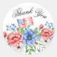 Este design floral vermelho, branco e azul patriótico inclui uma bandeira americana e é perfeito para o verão, o quarto de julho ou qualquer outro feriado patriótico americano. O texto cursivo diz "Obrigado."