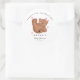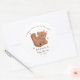 O tema do urso chá de fraldas favorece o adesivo com ilustração desenhada à mão de um filhote com arco e corações cor-de-rosa. O texto diz "obrigados para comemorar!" Perfeito para o chá de uma garota.