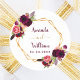 Um quadro fino de cor dourada, em forma geométrica, com rosas de cor d'água boêmia, estilo boho, flores em burgundy e rosa. Personalize e adicione seus nomes, data do casamento.