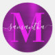Crie seu próprio nome personalizado feminino e adesivos monogramados de selo de envelope para o evento especial dela. Gradiente roxo, gráfico de folha falsa de arte digital colorida. Monograma contemporâneo brilhante magenta e branco com design de caligrafia elegante com estilo de assinatura em um adesivo redondo clássico.