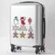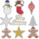 Os autocolantes do Natal, incluindo um boneco de neve, uma meia cheia de gulodias, um ornamento, um floco de neve, uma mensagem de Natal, Um pão de gengibre, uma estrela e uma mulher de pão de gengibre.