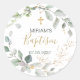 Batismo Bebê/Vinheta Redonda de Natal. Este design apresenta uma ilustração da folhagem verde e ouro no estilo de aquarela.