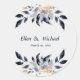 Adesivo Redondo Clássico Folhas Azuis com Bodas de Ouro projetado com folhas delicadas e macias em tons de Azul Escuro e Azul Claro, acentuadas com destaques em dourado. O texto inclui: os primeiros nomes dos Noivos e a Data do Casamento. Para personalizar, basta inserir seus detalhes em nosso modelo fácil, substituindo o texto de exemplo. Certifique-se de ver toda a Coleção Folhas Azuis com Bodas de Ouro para peças correspondentes.