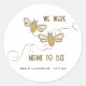 Abelhas bonecas, mas elegantes, encontram-se em caminhos bem definidos e encurralados de ouro metálico. "Fomos feitos para a Bee" está escrito em um texto decorativo de cor verde para adicionar um toque leve, mas sofisticado. Os nomes dos casais de casamento são impressos em letras formais por baixo das abelhas dançarinas. Use isto para Chás de panela ou como selos de envelopes para convites e obrigado.