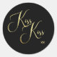 Fonte de texto em ouro estiloso com a frase "Beijo Beijo" e dois xx abaixo das palavras. A fonte dourada é um falso papel alumínio dourado e fica em cima de um fundo preto. A caligrafia é um estilo elegante e minimalista com um xx duplo sem serifa. Fonte de texto elegante em ouro mínimo Dizer beijo beijo Adesivo redondo clássico.