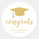 Um adesivo de graduação moderno com boné de formando e "parabéns" em uma tipografia elegante, juntamente com o nome do formando e o ano de aula em ouro sobre fundo branco. Estes autocolantes simples e bonito são perfeitos para um formando feminino e são excelentes como selos de envelopes ou para favoritos para festas.