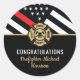 Este design apresenta uma bandeira de bombeiros com listras pretas e brancas, e uma fina faixa vermelha também. "Parabéns" e o crachá de bombeiro ficam acima do nome do bombeiro graduador. Esta design também funciona como excelente para se aposentarem bombeiros, tenentes ou chefes. Celebre em estilo!