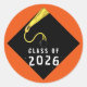 Adesivos de presente de formatura, selos de envelope e etiquetas de lembrancinhas de festa com o clássico chapéu de formatura preto com borla dourada em fundo laranja. Perfeito para formandos celebrando com a Turma de '26. Para personalizar, edite o texto para alterar o ano.