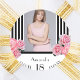 Elegante, glamouroso e feminino para a 18ª festa de aniversário de uma menina. Listras verticais negras e brancas clássicas e esbeltas. Decorado com flores, peônias e rosas cor-de-rosa. Modelos de nome, idade 18, data de nascimento e data do aniversário. Modelo para sua própria foto vertical. Menina e elegante!