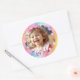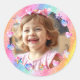 Adicione a foto da sua filha ao adesivo de festa de aniversário desta menina fofa. Estrelas bonitas, corações e fundo arco-íris em rosa, roxo, amarelo e chato.