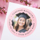 Adesivos de formatura com sua foto dentro de uma moldura ondulada e seu texto personalizado em volta da foto. Texto preto em fundo rosa ou cor personalizada.
