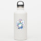 Design apresenta uma garrafa decorativa de perfume azul embelezado com flores azuis e roxas.