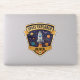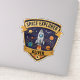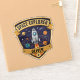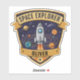 Este adesivo personalizado apresenta um emblema de explorador espacial ousado e vibrante. No centro do emblema está um foguete de desenho animado divertido voando pelo espaço com planetas orbitando ao seu redor.