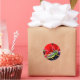Este adesivo brilhante apresenta um gafanhoto verde-brilhante, amarelo e preto gravado no centro roxo de uma flor com pétalas vermelhas lindas.