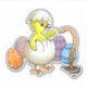 O pintinho recém-eclodido deseja uma felz pascoa à minhoca.