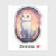 Uma curiosa gata branca olha para o céu estrelado, empoleirada em uma rocha contra um cenário deslumbrante de pôr do sol. Com seus olhos arregalados e esperançosos e expressão serena, essa encantadora ilustração captura a magia e o encanto da natureza. Perfeita para adicionar um toque de capricho e calor ao seu lar ou acessórios.