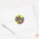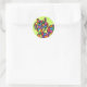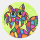 Este gato único e colorido se senta sobre um fundo verde-primavera e olha para o espectador, mostrando suas marcas multicoloridas, como mosaico, que se assemelham ao vidro colorido. A cena inteira está cercada por uma borda multicolorida que combina com suas marcas.