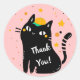 Adorável gatinho preto estilizado vestindo um boné laranja no fundo de estrelas e pontos. O texto está em branco e é personalizado. Esta é uma ilustração digital.