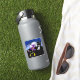gato preto vestindo um chapéu de bruxa roxo com uma faixa amarela. O gato está sentado em frente a uma casa assustadora em uma colina com uma lua cheia ao fundo. A casa é preta com um telhado roxo e um morcego voando acima dela. O fundo é azul escuro com estrelas e uma lua cheia. A imagem está em um fundo branco.