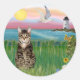 Um gato-do-mato-pequeno americano fica sentado à beira-mar entre as flores, enquanto uma gaivota em direção a um farol à distância, enquanto as ondas subem às rochas. O sol brilha e a vida é boa.