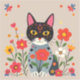 Vinheta com ilustração de um gato branco e preto rodeado de flores coloridas laranja e cor-de-rosa.