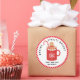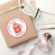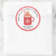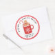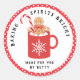 Este adesivo de Espíritos Brilhantes apresenta uma caneca de marshmallow com cacau quente com um biscoito de pão-de-gengibre com um fundo branco e uma bolinhas vermelha e branca na fronteira externa. Coordena-se com a coleção de Bolachas de Natal.