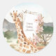 Adicione um adorável tema de safari personalizado à festa de aniversário ou chá de fraldas da sua garotinha ou rapaz com este adesivo de girafa de aquarela bonito. Sticker tem uma girafa em frente a uma savana africana. Há também flores e um lugar para o seu texto personalizado. Faz uma bonita adição personalizada a uma celebração!