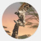 Uma girafa adulta cumprimenta uma girafa bebê contra o pano de fundo de um pôr do sol africano.