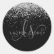 Rosa Black Silver Metal Monograma Nome Clássico Round Sticker Personalize facilmente este design de adesivo chique moderno com elegante brilho prateado em fundo preto. O design apresenta seu monograma manuscrito com espirais bonito e seu nome.