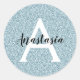 A brilha azul-prata brilha o nome do monograma e o clássico autocolante redondo. Personalize com seu nome personalizado em um roteiro preto elegante e seu monograma inicial em branco. Você pode alterar a cor do texto, o estilo e o tamanho da fonte usando a opção personalizar.