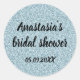 Adesivo redondo personalizado para um chá de panela. Este adesivo apresenta um elegante escrevendo preto e um brilho prateado azul claro brilha fundo. Você pode personalizá-lo com seu nome e data de chá de panela. Você pode até alterar a cor do texto e o estilo da fonte usando a opção personalizar.