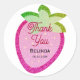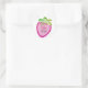 Captivando o adesivo de Aniversário de Morango Rosa Y2K. Este design apresenta um morango muito grande, cor-de-rosa e verde, brilhando sobre fundo branco.