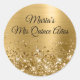 Crie seu próprio rico monograma na moda marco 15 de aniversário de festas de festas de festas para ela. O plano de fundo apresenta um gráfico de arte digital em formato digital, com formato embebido em metal amarelo ouro. Ao longo da base está uma banda de dourada faux brilhando cintilante cintilante. Personalize a cor, o tamanho ou o estilo da fonte. Todo o texto é personalizável neste design. Os faíscas de luxo, brilho e folha serão criados com elementos artísticos criativos que impressão nos convida como uma foto. 15 de adesivos redondos para ela.