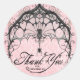 Este Halloween Obrigado O adesivo tem um estilo gótico teia de aranha com uma aranha em preto sobre um fundo úmido rosa. O texto diz "Obrigado por passar."