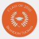 Este design apresenta uma etiqueta de formando de formando de graduação, um elegante selo clássico moderno, um boné clássico de cartão-morteiro, folhas de laureado clássicas, uma classe personalizada de nomes, tema laranja brilhante colorido colorido da escola, um rótulo de convite de festa de formando de graduação, um adesivo de festa de formando, uma celebração de celebração de festa de formatura, para etiquetas de formando de graduação