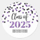 Classe de nome personalizado de adesivos de graduação 2025 com padrão de confete roxo e preto.