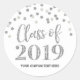 Classe de nome personalizado de adesivos de graduação 2019 com um padrão glamouroso de confetti prateado e texto preto de estilo escrito.