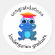 Bons e personalizados adesivos para a graduação do jardim de infância do sapo para comemorar sua conquista. Design mostra um sapo azul-lacrimogêneo, que é personalizável e que lê PARABÉNS FORMANDO KINDERGARTEN. Presentes correspondentes disponíveis.