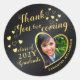 Crie os adesivos exclusivos de preto e ouro Obrigado pelos favores da Festa de formatura de 2025 com um design elegante que apresenta uma foto em forma cardíaca, o nome do Formando e o ano. Use a modelo para digitar o nome e o ano do Formando e carregar uma foto antes de fazer o pedido.