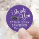 Adicione um toque personalizado elegante à graduação da faculdade ou do segundo grau, obrigado a cartões e favoritos para festas com adesivos roxos e brancos redondos / selos de envelopes. Todo texto é simples de personalizar. Design apresenta um fundo roxo, um boné de conselho de argamassa preta e uma tipografia do estilo de caligrafia moderna. Parabéns ao formando!