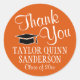 Adicione um toque personalizado elegante à graduação da faculdade ou do segundo grau, obrigado a cartões e favoritos para festas com adesivos redondos laranja, preto e branco / selos de envelopes. Todo texto é simples de personalizar. Design apresenta um fundo laranja, boné de conselho de argamassa preta e tipografia de script do estilo caligrafia moderno. Parabéns ao formando!